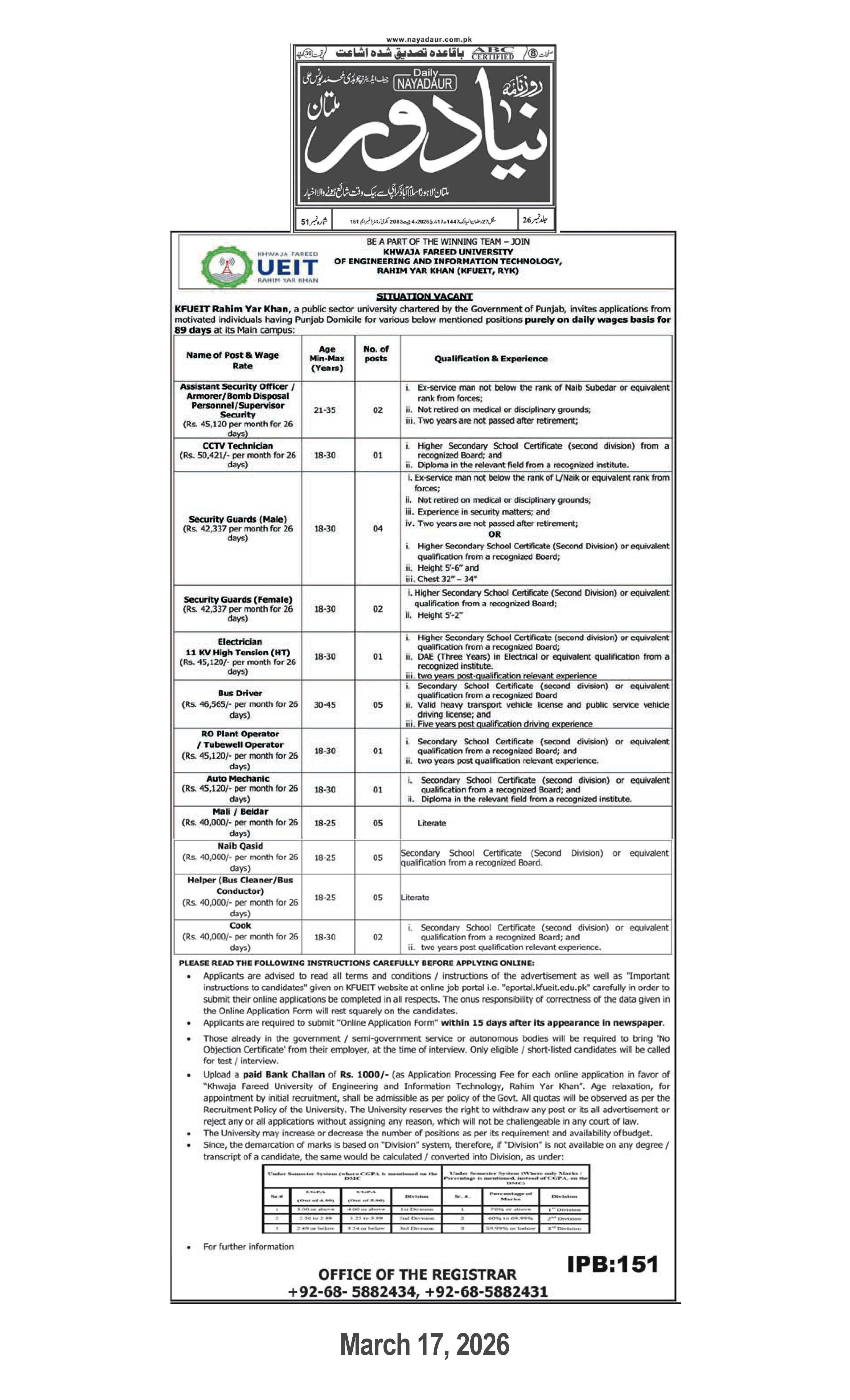 | 1 | Advertisement for Non-Teaching Positions on Daily Wages – March 2026 | Expired | 2026-04-01 | Download | |
