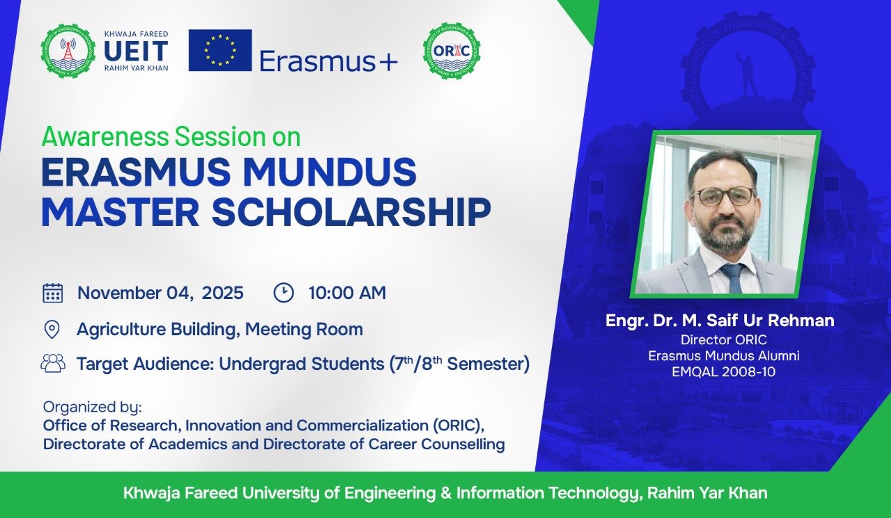 RAHIM YAR KHAN, PUNJAB – November 4, 2025 – Khwaja Fareed University of Engineering and Information Technology (KFUEIT) successfully hosted a crucial awareness seminar on the Erasmus Mundus Master Scholarship Program 2026-28, aimed at preparing final-year undergraduate students for this prestigious international opportunity.